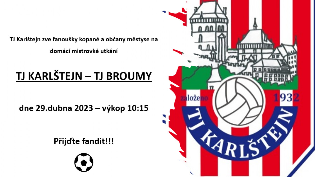 jménem TJ Karlštejn bychom Vás chtěli pozvat na mistrovské utkání v kopané mezi karlštejnskými fotbalisty a TJ BROUMY. Utkání začíná v sobotu 29.4. v 10.15
