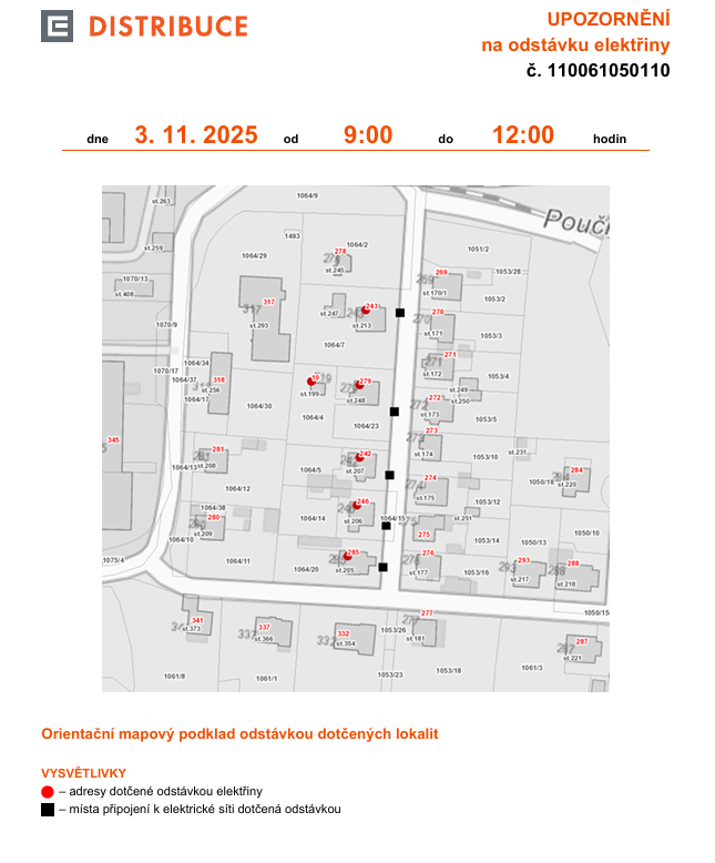 chtěli bychom Vás informovat, že 3.11.2025 mezi 9.00 a 12.00 bude přerušena dodávka elektrické energie v Karlštejně - odstávka se týká č.p. 242, 243, 246, 279 a 285, a č.ev. 19