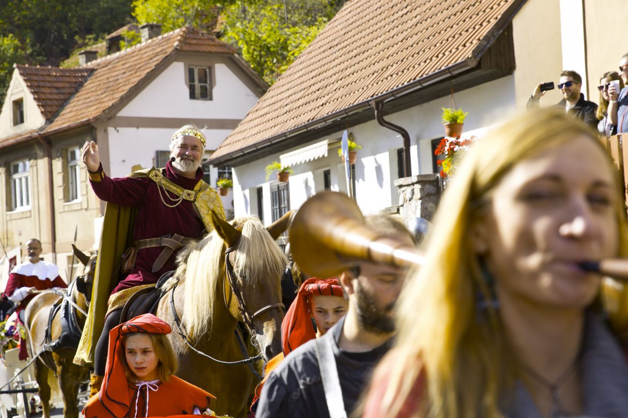 200 členný průvod v gotických kostýmech v čele s císařem římským a králem českým Karlem IV. a jeho chotí Eliškou Pomořanskou přenese návštěvníky do 14.století . Nejen ochutnávka vín, burčáku a kulinářských specialit, ale i dobové stánky s ukázkami řemesel, vystoupení šermířů, kejklířů a pištců, výuka historických tanců a večerní ohňové představení je součástí bohatého programu pro děti i dospělé. Program probíhá po oba dva dny na hradě i v podhradí .